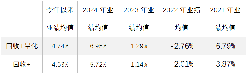 不论是在行业轮动加剧、主体投资盛行的2023年,还是红利策略一马当先的2024年,以及结构性牛市特征明显的今年,“固收+量化”基金整体表现上基本优于非量化增强的“固收+”基金。